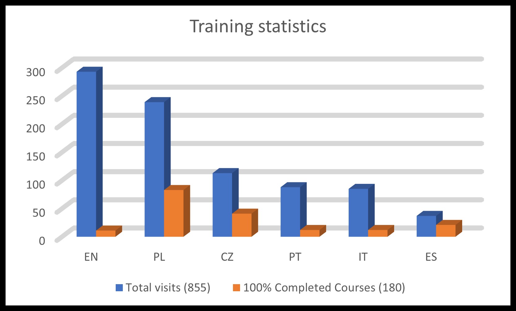 Until the end of July, 855 access to course modules have been registered. 180 courses have been completed 100% in one session, and based on the number of visits, we can estimate that at least another 200 courses have been completed in two or more sessions.